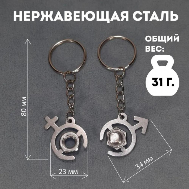 Уникальный набор их двух брелков, скручивающихся между собой болтиком и гаечкой. Брелки выполнены из нержавеющей стали, с использованием качественных метизов. Поверхность брелков гладкая блестящая, их приятно держать в руках. Брелок подходит в качестве игрушки антистресс, благодаря подвижным элементам. Аксессуар можно использовать с любой сумкой, рюкзаком или ключами. Брелки можно подарить на 23 февраля, на день рождения, а также в качестве корпоративного подарка.